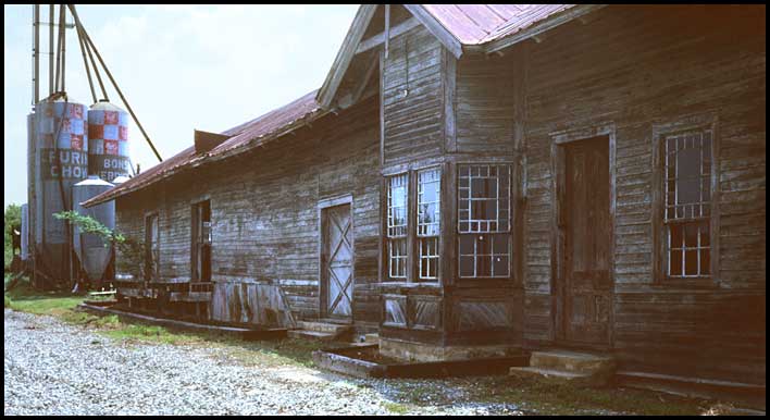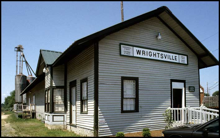 | A ca. 1915 photo of the Wrightsville depot online in the Georgia Archives' Vanishing Georgia collection raises some interesting questions. For one, is it the same building? A caption indicates that the depot shown ca. 1915 was demolished, but it appears to be the same structure shown on this page, except for the extension on the right (behind the wagon). The trackside facade seems to match, but the window and door arrangement on the end do not. Could the demolition report refer to the right-side extension, or to the building barely seen on the left side of the photo?