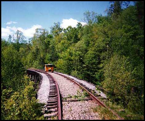 | Motorcar on Turniptown Creek trestle, between Ellijay and Blue Ridge, in 1997. At the time, NARCOA volunteers were helping to remove overgrowth from years of disuse. (Photo by Kenneth Huffines). |