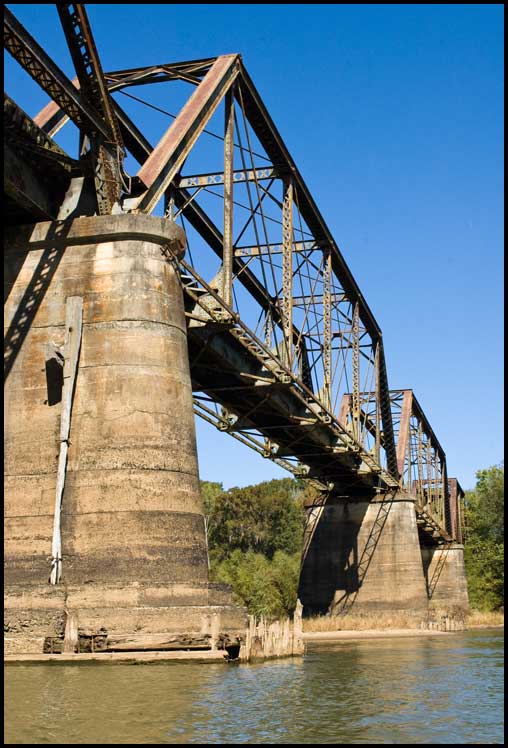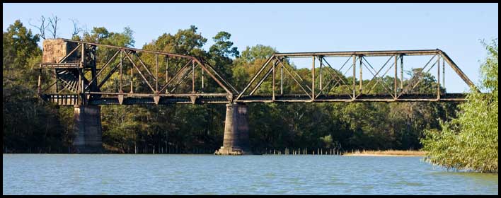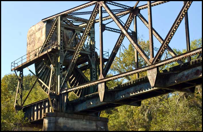 | The Altamaha River begins at the merging of the Ocmulgee and Oconee in south central Georgia. About a mile downstream from that confluence is this former Georgia & Florida Railroad bridge, built by the American Bridge Company in 1908-09 at a cost of slightly under $140,000. Alongside the south river bank is the drawbridge section. Of a type known as a Scherzer rolling lift, the 102-foot lift span rolls back from the river in a motion somewhat similar to that of a rocking chair. As it rolls, a huge counterweight moves down while the truss and railbed move up. In the photo above, the counterweight can be seen at the top left. Directly under it are the two "rockers," called segmental girders, on which the span rolls. When the bridge is closed, trains pass beneath the counterweight and between the segmental girders. |