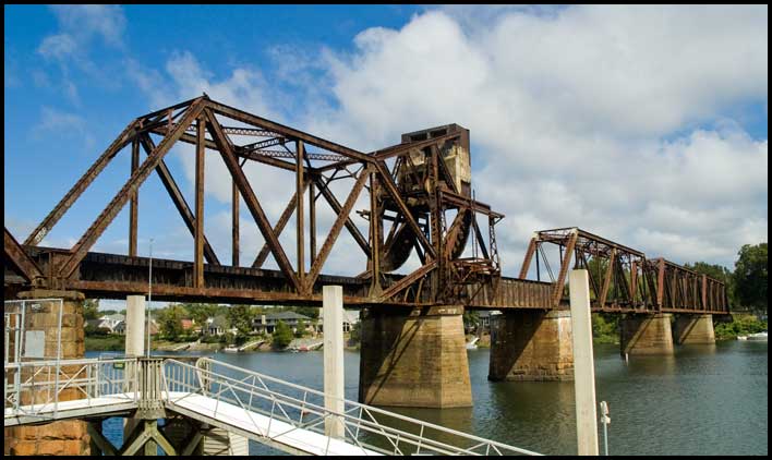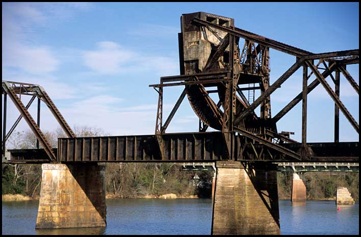 | This bascule bridge carries Norfolk Southern trains from South Carolina into downtown Augusta (where they travel down the middle of Sixth Street to connect with other lines). Built for Southern Railway in 1912, it has a 101-foot lift span designed by the Scherzer Rolling Lift Bridge Company of Chicago.