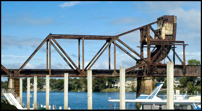 A bascule bridge moves vertically by rotating upward from one pier. Like the vertical lift bridge, a bascule bridge has counterweights that help motors move the multi-ton span. The bridge above, over the Savannah River in downtown Augusta, is a rolling lift bascule. Its counterweights can be seen in the top right of the photo. The days when these particular movable bridges actually moved may be coming to an end. Today the Omaha bridge stays in the up position because the railroad it carried has been abandoned. The bridges at Lumber City and Augusta still carry trains but barge and steamboat traffic has vanished so there is seldom a reason for these bridges to move. |