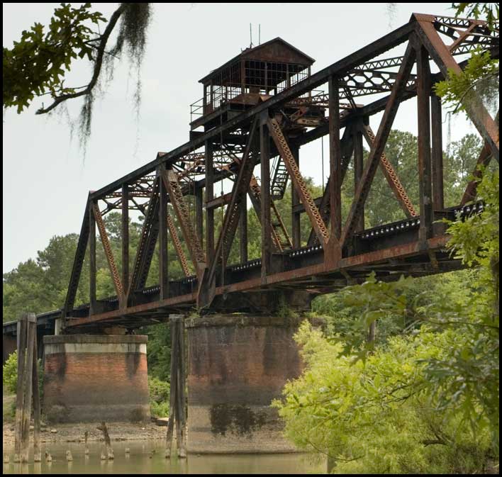 | Swing bridges move horizontally rather than vertically. Pivoting atop a pier, the span can "swing" away from the navigation channel, allowing a boat to pass with no vertical obstruction. This bridge is over the Ocmulgee River at Lumber City, between Macon and Brunswick. |
