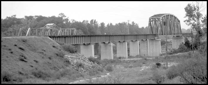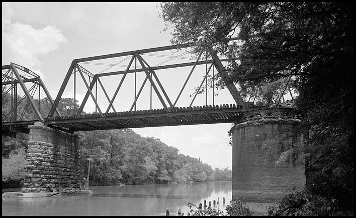 | The East Tennessee, Virginia & Georgia Railroad had a swing bridge over the Ocmulgee River at Hawkinsville (above). Built by the Louisville Bridge and Iron Company in 1890, it had a 182-ft swing span and a 152-ft fixed span. (View above is toward Hawkinsville side. Swing span is on the right.) |