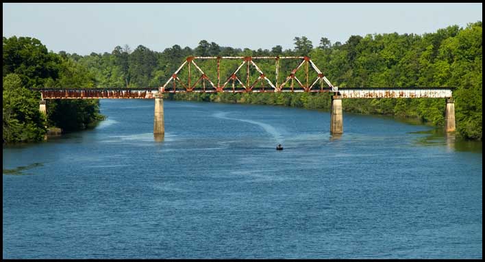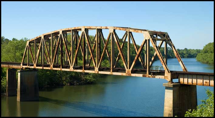 | Some movable bridges in Georgia have been lost to demolition. One example, shown below, is the former Seaboard Coast Line swing bridge over the Chattahoochee northwest of Donalsonville. |