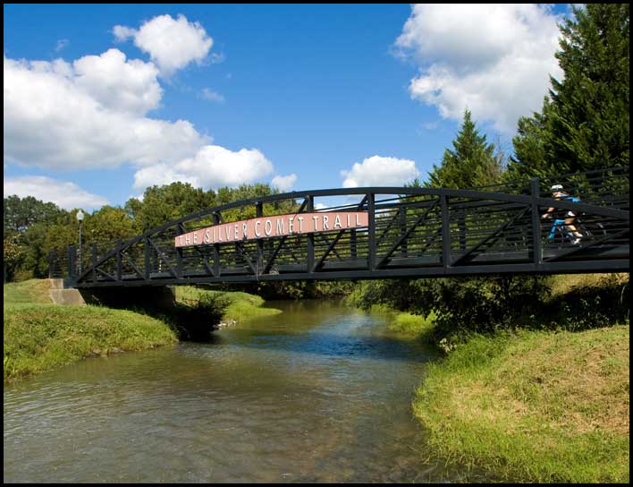 To the east, between Rockmart and Powder Springs, Norfolk Southern's Rome-Atlanta line closely parallels the trail, passing under it between Dallas and Hiram. NS trains can often be heard even when they can't be seen, adding a bit of appropriate horn music to the railfan's bike ride. While the eastern end of the trail is curently at Mavel Road in Cobb County, the abandoned rail bed actually extends another three miles to the Chattahoochee River. A recently established "Connect the Comet" group is advocating extension of the trail to the river, along with a possible connection to the new Atlanta Beltline trail system. |