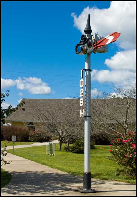 | Near the Euharlee Creek bridge is this old train signal. The structure in the background is a community center built to look like a railroad depot. |