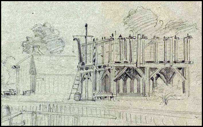 Above is the water tank of the Western & Atlantic Railroad at Big Shanty, now Kennesaw, Ga., drawn by Alfred R. Waud in 1864. (Cropped image. For complete image, see this page at the Library of Congress). |