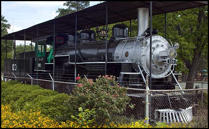 | No. 100 served the Georgia, Ashburn, Sylvester & Camilla Railway. The 2-8-2 engine was built by Baldwin in 1930 (builder's no. 61292). It now stands in a park at the junction of Highways 82 and 33. |